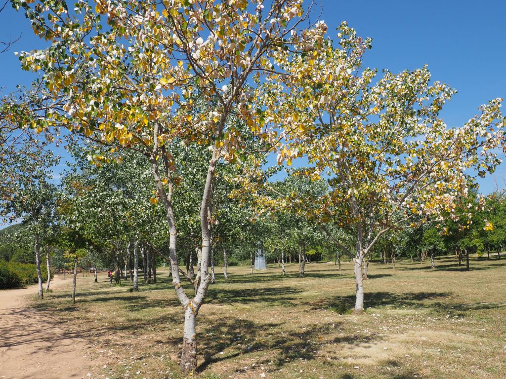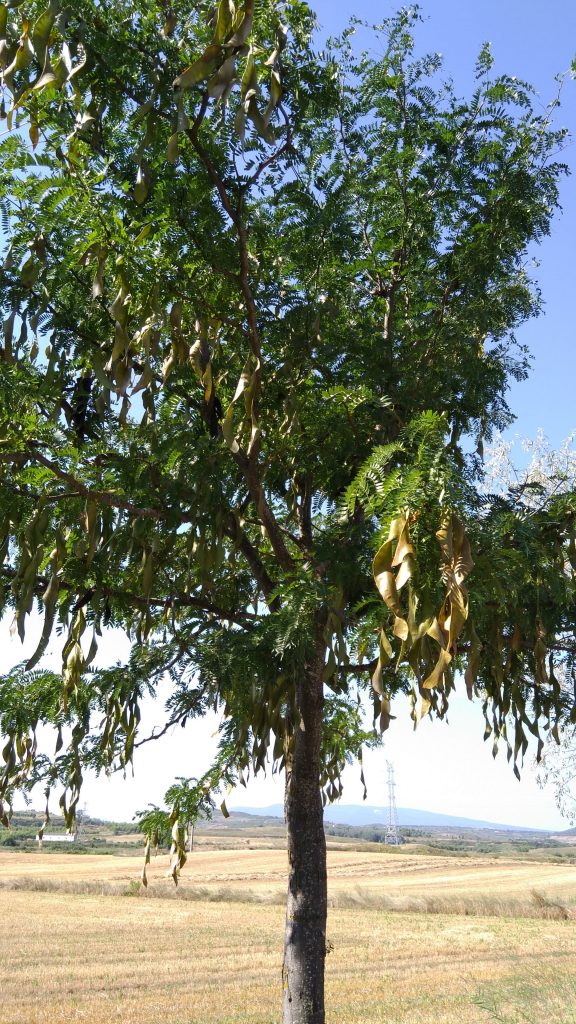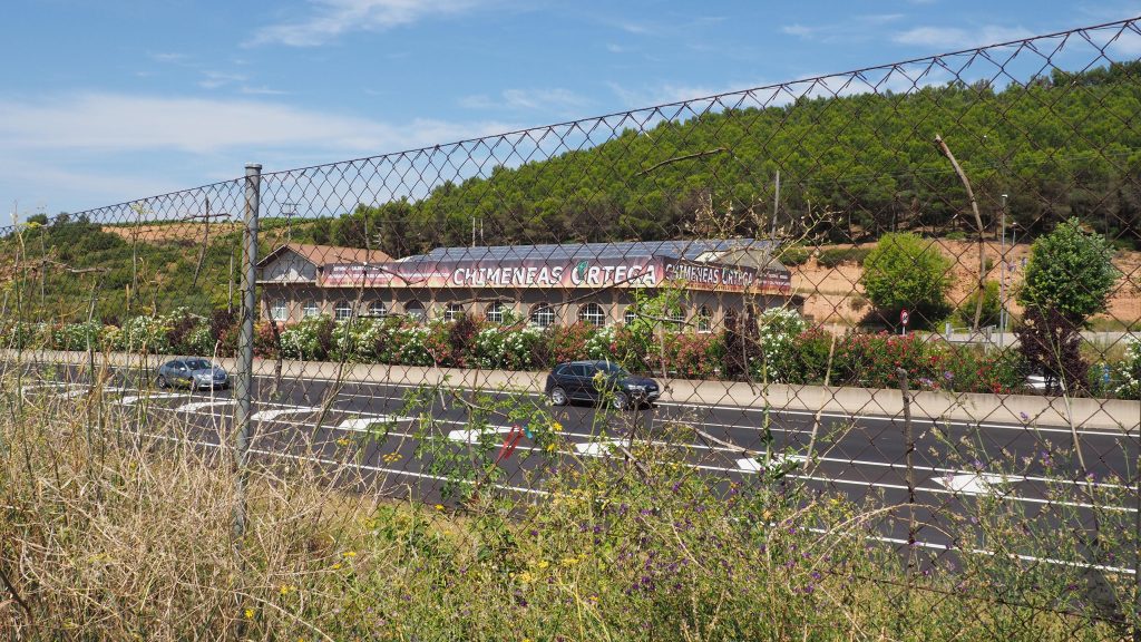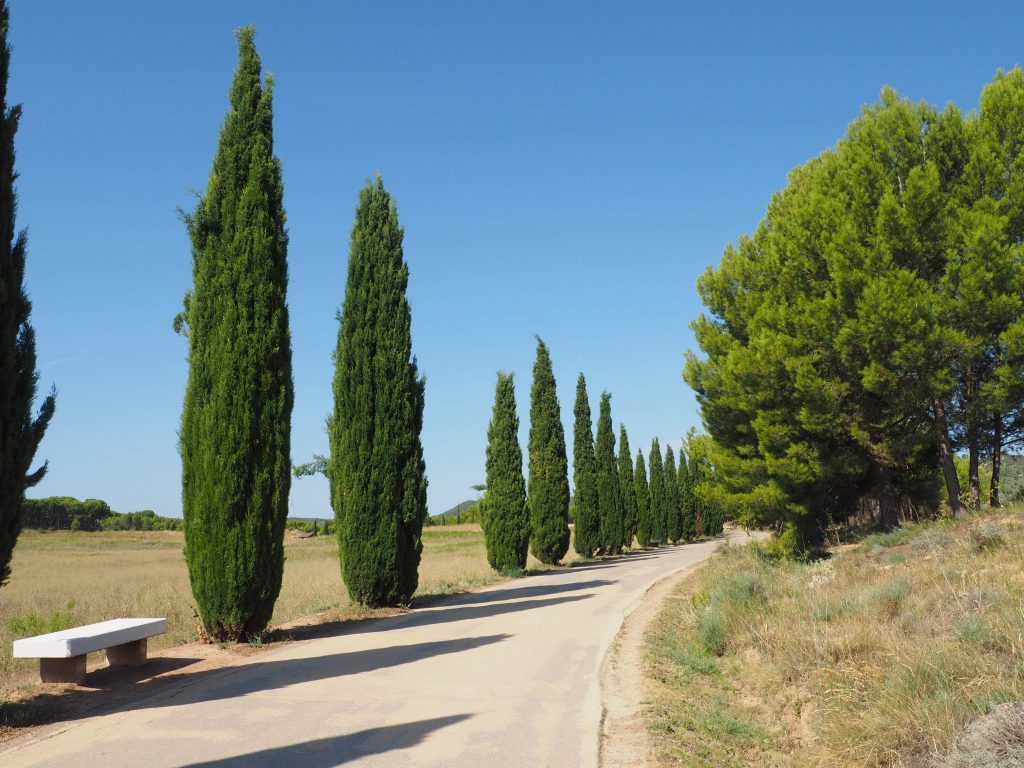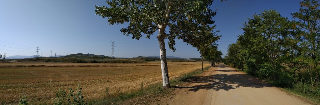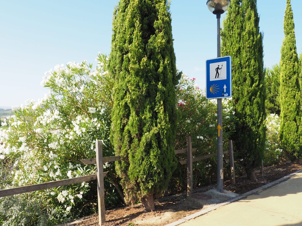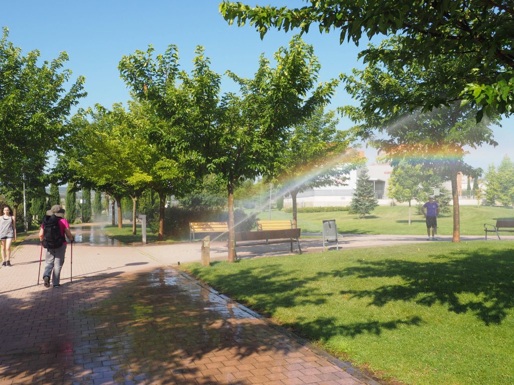 Zuerst führt der Weg noch relativ lange durch die Stadt selbst, wir nutzen also so gut es geht den Schatten der Häuser. In einem Supermarket gönnen wir uns noch ein Eis. Am Rande der Stadt verläuft der Camino über eine große Parkanlage mit riesigen Oleandersträuchen, schlanken Zypressen und Bewässerungsvorrichtungen mit kleinen Regenbögen, die sich über die Wasserstrahlen auffächern.