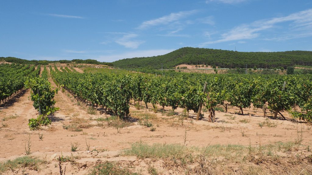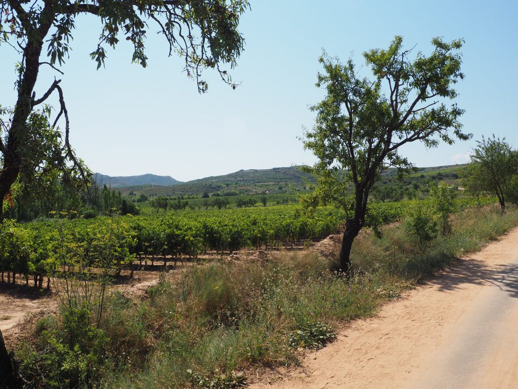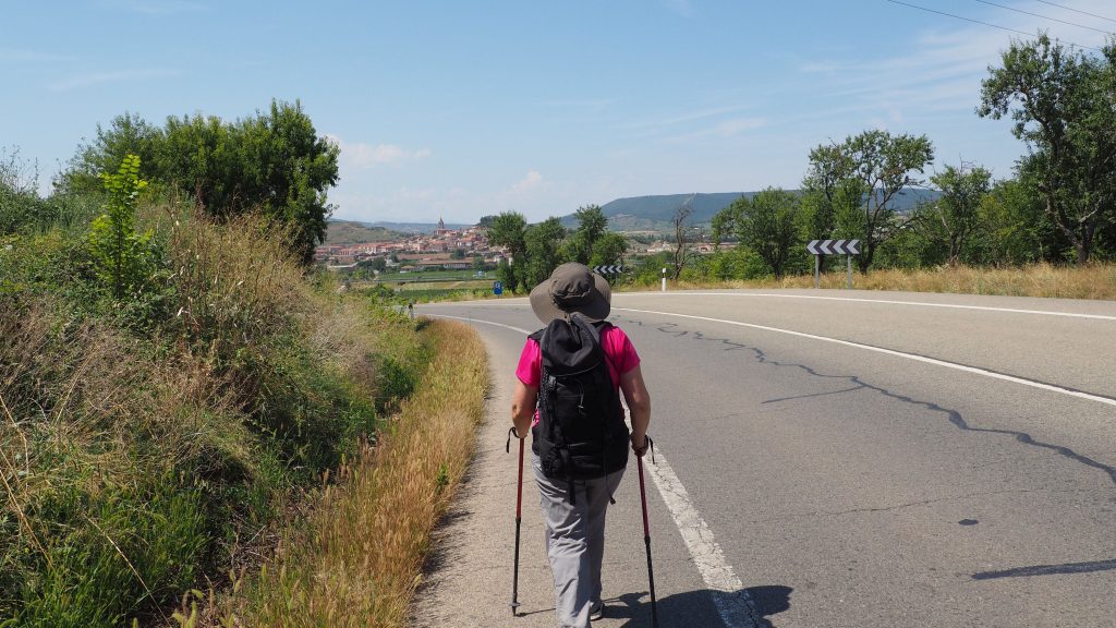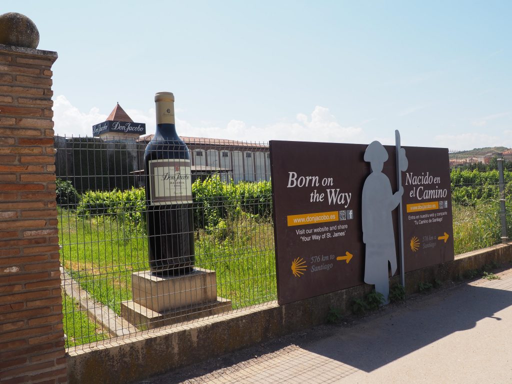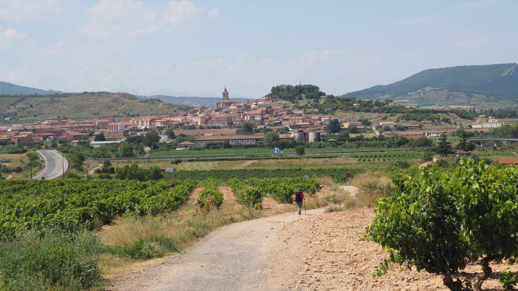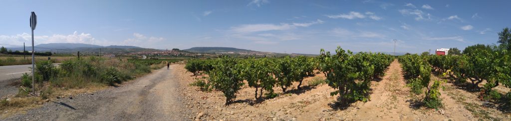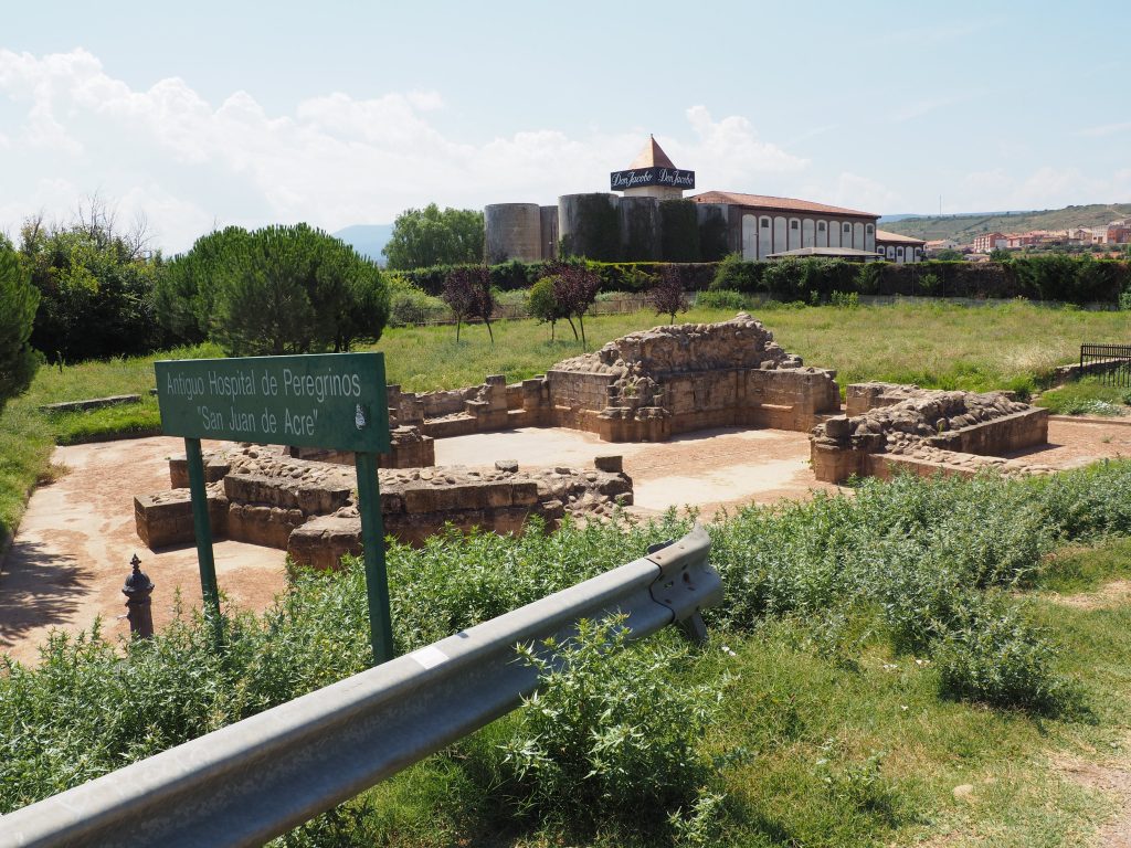 Endlich erscheint vor uns Navarrete. Wir laufen jetzt auf einem Schotter-Sand-Pfad zwischen den Weinbergen. Die Mischung aus Sonne, Hitze und Staub macht uns echt zu schaffen. Die Weinwerbung direkt am Weg mach einem den Durst noch bewusster. Der Schild „Hospital de Peregrinos San Juan de Acre“ bezieht sich leider nur auf die 30 cm hohe Ruine an der wir vorbeilaufen. Wir müssen also noch weiter.