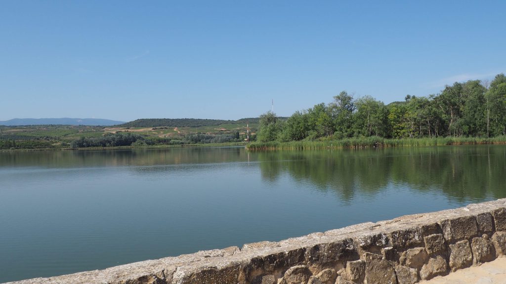 Dann führt der Weg ein Stück in der prahlen Sonne direkt am Stausee – Pantano de la Grajera. Mehrere Fahrradpilger sausen an uns vorbei. Ein Fahrrad hätte ich jetzt auch gerne um aus der Sonne schnell zu verschwinden. Gleich danach kommt zum Glück ein Stückchen Wald mit ein paar Bänken, auf die wir uns dankbar fallen lassen. Um uns herum toben sich Eichhörnchen aus.