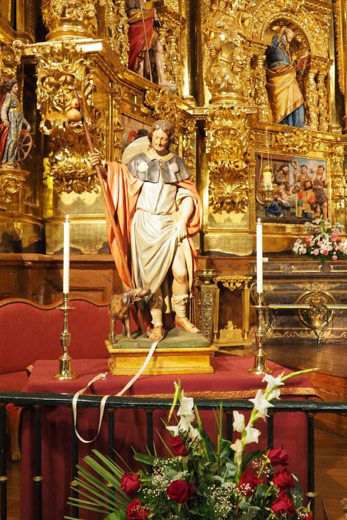 In der Kirche steht eine Figur des Heiligen Rochus. Mittlerweile verwechsle ich ihn nicht mehr mit Jakobus – der Rochus hat meistens einen Hund bei sich und Wunden an den Knien. Aber warum? Das muss ich noch nachforschen.