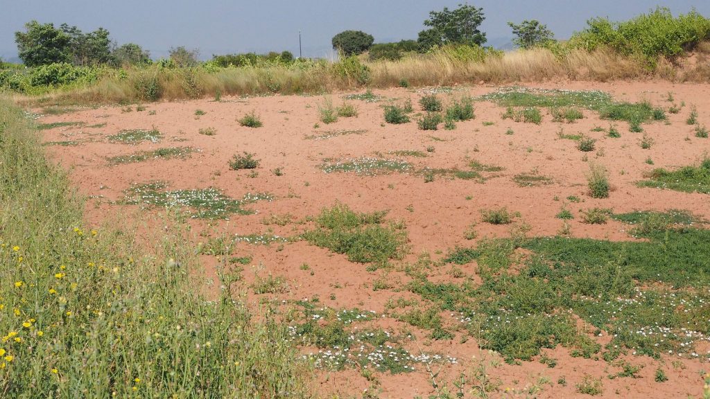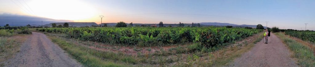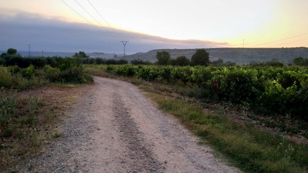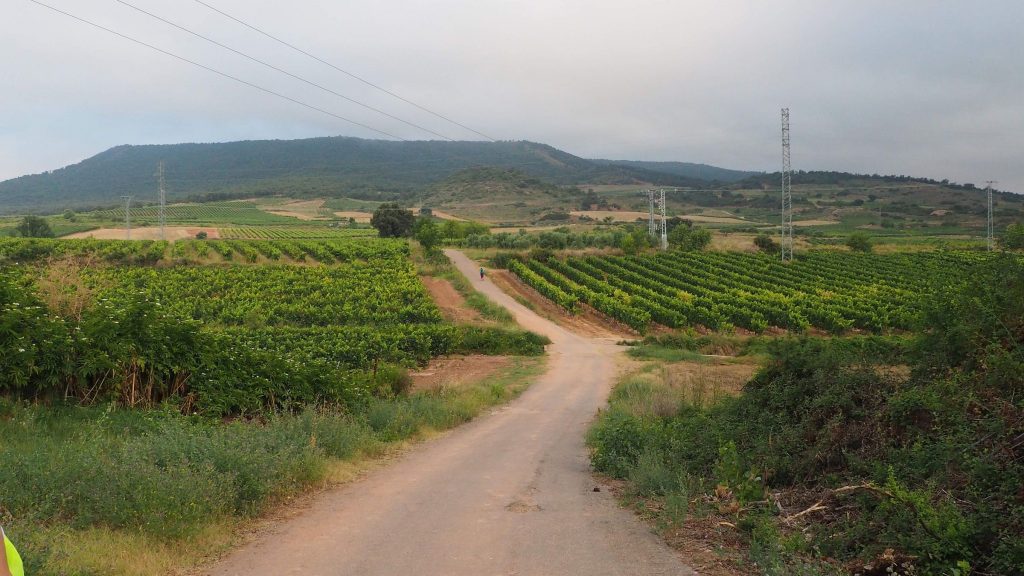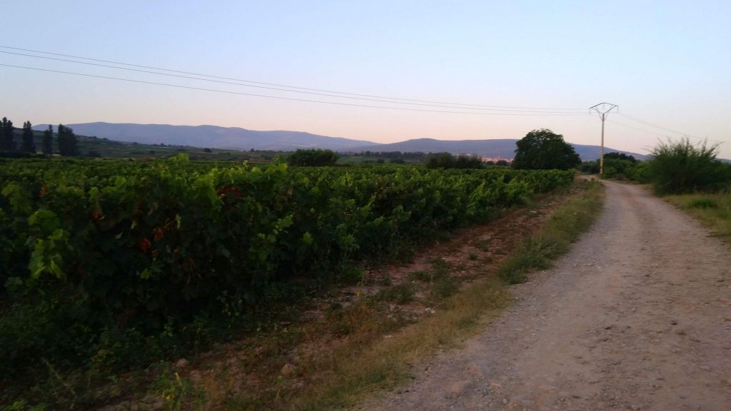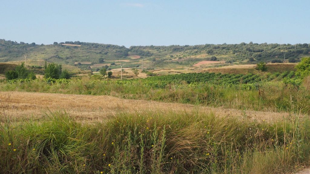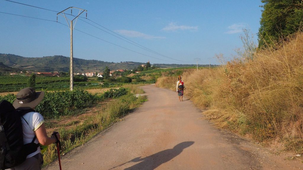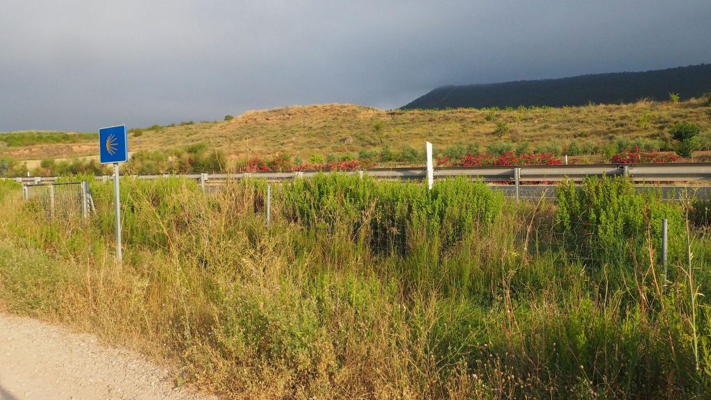 Es geht weiter. Vor uns liegen noch 9 Kilometer. Langsam wird es richtig warm und ich spüre eine wunde Stelle an meinem Oberschenkel. Baumwollunterwäsche ist nicht automatisch das Beste für lange Wanderungen. Der Weg führt weiterhin auf Feldwegen zwischen Weinbergen und Ackern. Dann wieder ein Stück entlang der Hauptstraße, an einigen Industriegebäuden und Baustellen. Kurz vor Najera gibt es noch eine kleine Parkanlage und der Anblick der Bänke ist sehr verlockend. Wir bleiben trotzdem stark, die Perspektive in noch größerer Hitze zu laufen schreckt zu sehr ab.