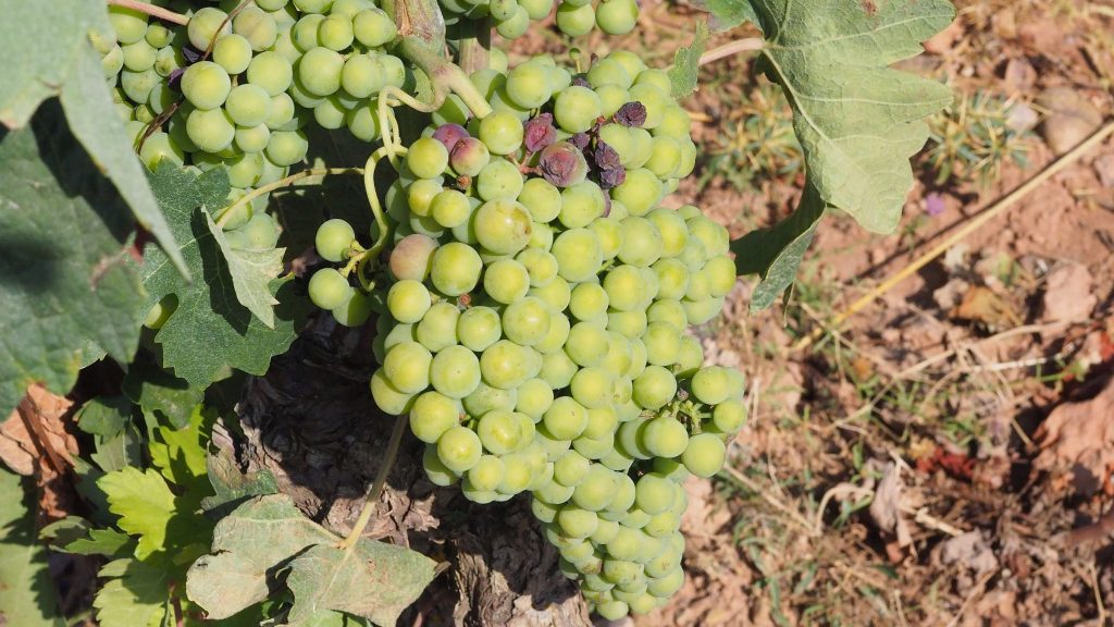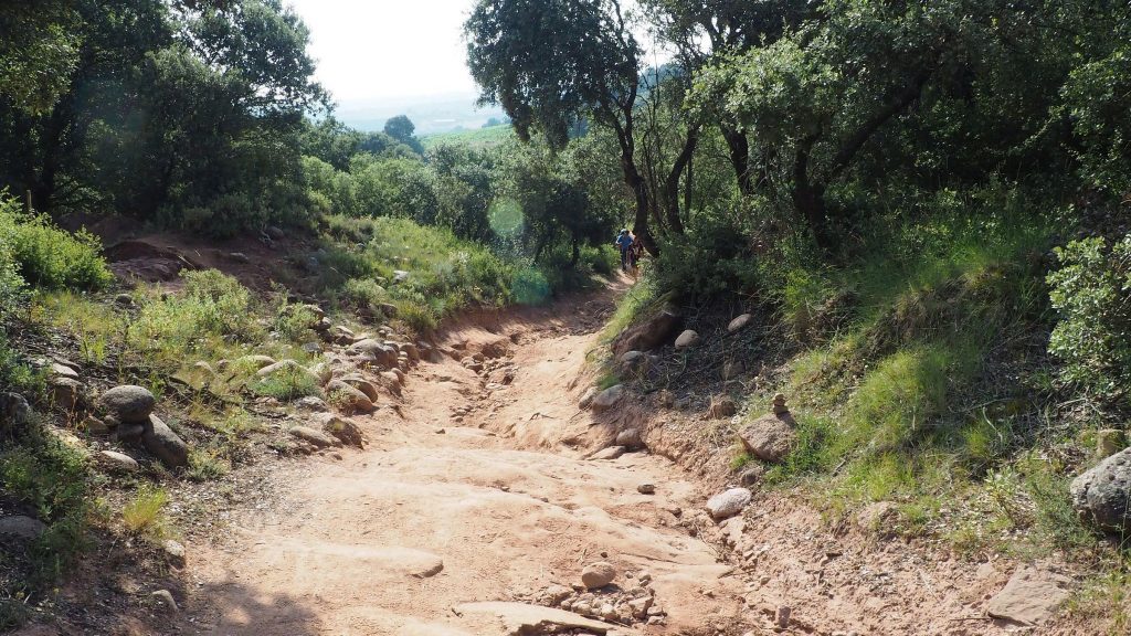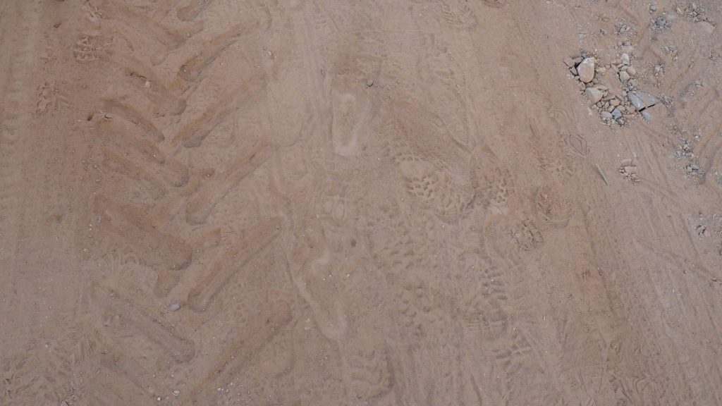 Die Morgenfrische tut richtig gut. Weinberge über Weinberge umrandet von kleinen Hügeln – eine echte Augenweide. Uns kommt’s vor wir wären in Österreich. Der Weinviertler Jakobsweg vor 5 Jahren sah ziemlich ähnlich aus. Die Sonne blinzelt vereinzelt zwischen den Wolken und das Gehen in dieser wunderschönen grünen Umgebung ist ein Genuss. Außer eines Traktors begegnen wir soweit niemandem. Auf einmal entdecken wir im Sand vor uns Fußabdrücke und zwar nicht von Schuhen sondern von nackten Füßen. Jemand geht vor uns den Jakobsweg tatsächlich barfuß. Ob das wohl eine besondere Form der Buße ist?