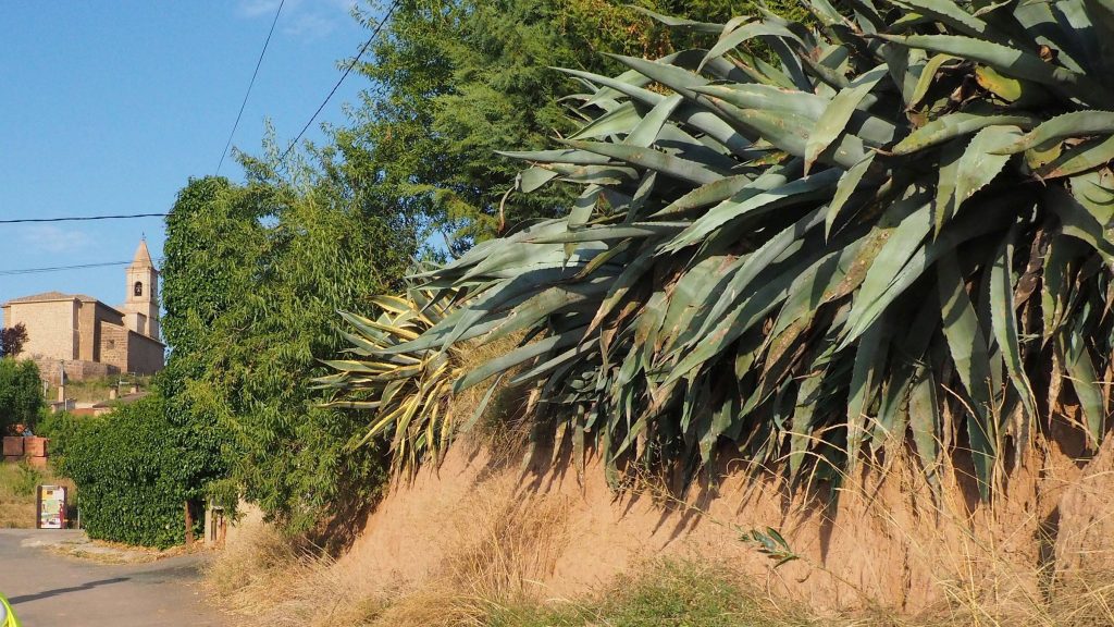 Unterwegs gibt es aber keine einzige Einkehrmöglichkeit. Wir schlagen also 600 m drauf und machen nach der Hälfte der Strecke einen kleinen Abstecher bzw. Umweg über Ventosa. Da entdecken wir auch den Barfußpilger. Mit seiner Gitarre und langen bunten Kleider sieht er aber eher wie ein Hippie als bußorientierter Katholik. Seine Wanderschuhe baumeln übrigens hinten am Rucksack, also womöglich wollte er einfach nur den warmen Sand über den wir laufen, hautnah erleben.
