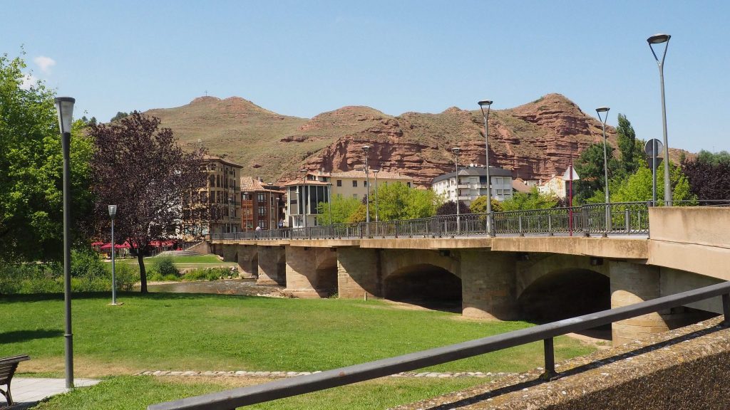 Wir müssen noch zuerst durch die Brücke über den Najerilla-Fluss in die Altstadt. Dieses Teil von Najera scheint an die steile rotbraune Felswand angeklebt zu sein und irgendwie beunruhigt mich der Anblick. Zum Glück ist unser Hostel nicht so nah daran, aber der Monasterio de Santa Maria la Real paar Hundert Meter weiter ist glaube ich zum Teil sogar in der Wand gebaut.