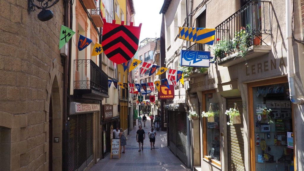 Die schmalen Gassen hier sind mit bunten mittelalterlich aussehenden Fähnchen geschmückt. Anscheinend gibt es hier um die Zeit eine Fiesta.