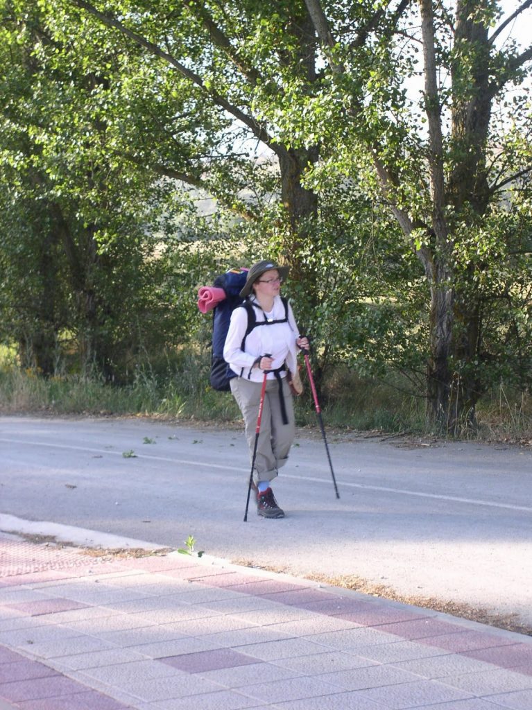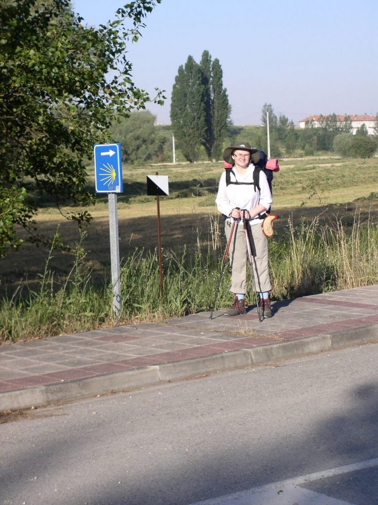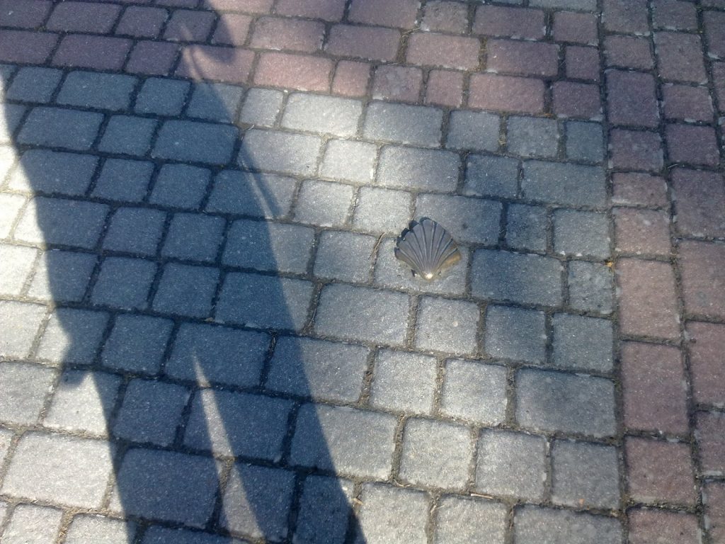 Die zwei Scheiben Zwieback mit Marmelade verdienen bei einem Mitteleuropäer allerdings kaum den Namen „Frühstück“ also stecke ich mir einen Müssliriegel vorsichtshalber in die Rucksack-Seitentasche, sozusagen griffbereit. Auf der anderen Seite eine volle Wasserflasche. Wir laufen los und finden prompt die ersten Jakobsmuscheln aus Metal, die in den Gehsteig eingelassen sind.